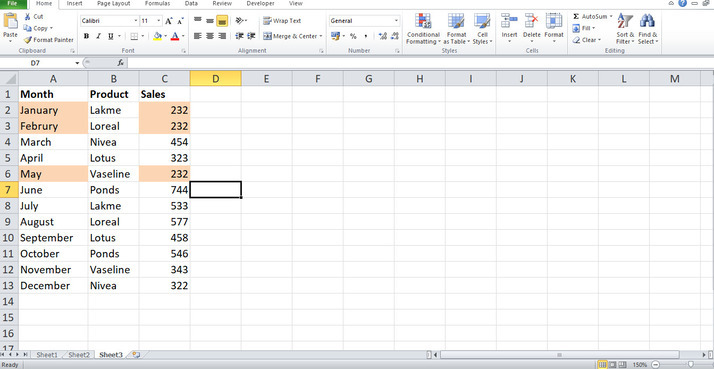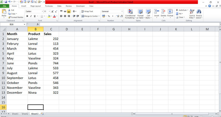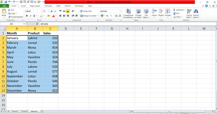 準備好包含資料的Excel表格。首先,開啟Excel表格並逐個建立資料。在這個表格中,輸入使用者想要在列表中突出顯示的月份、產品和銷售額,如下所示。