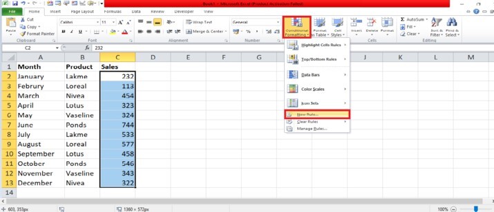 選擇表格中的所有資料後,將游標放在功能區。功能區頂部包含許多選項卡。將游標放在“開始”選項卡上,並單擊包含許多選項的選項卡。“開始”選項卡上,單擊“條件格式”的下拉選單。在此選項卡上,單擊“新建規則”選項卡,這將開啟如下所示的對話方塊。