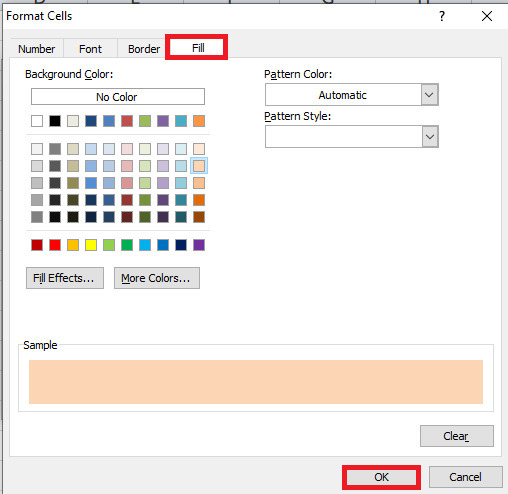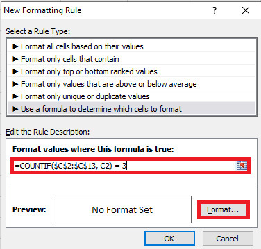 在對話方塊中,有一個輸入型別,將游標放在上面。現在,輸入公式 =COUNTIF($C$2:$C$13,C2)=3 來突出顯示X次的數字。在對話方塊中,將游標放在“格式”按鈕上並單擊它,這將開啟一個新的對話方塊“設定單元格格式”,其中包含“填充”選項卡。在“設定單元格格式”對話方塊中,包含了選項卡。現在,單擊“填充”選項卡,這將顯示如下所示的顏色主題。
