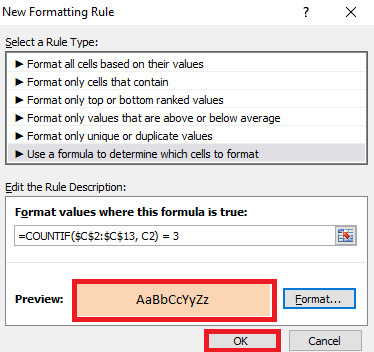 在對話方塊中,從顏色主題中選擇使用者想要突出顯示X次數字的任何顏色,然後單擊“確定”按鈕,這將關閉“設定單元格格式”對話方塊。關閉“設定單元格格式”對話方塊後,“新建格式規則”對話方塊將顯示如下。