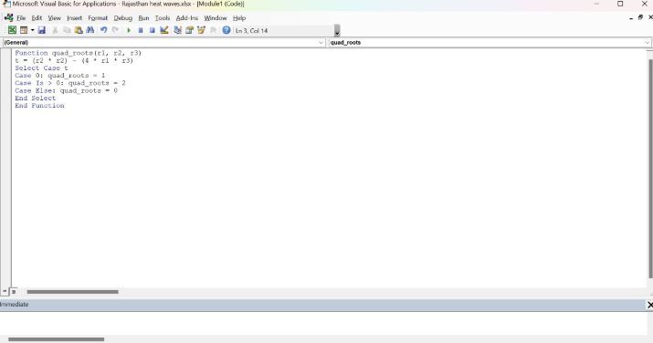 Function quad_roots(r1, r2, r3) 'compute the formula' t = (r2 * r2) - (4 * r1 * r3) Select Case t Case 0: quad_roots = 1 Case Is > 0: quad_roots = 2 Case Else: quad_roots = 0 End Select End Function