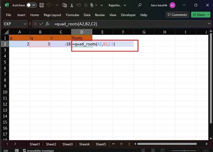 在D2單元格中編寫公式=quad_roots(A2,B2,C2),如下面的影像中突出顯示的那樣: