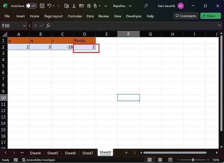 按“Enter”鍵以評估二次方程的實根。因此,我們成功地在D2單元格中呼叫並測試了該函式。結果值在下面的影像中突出顯示: