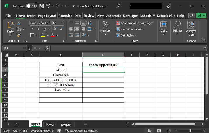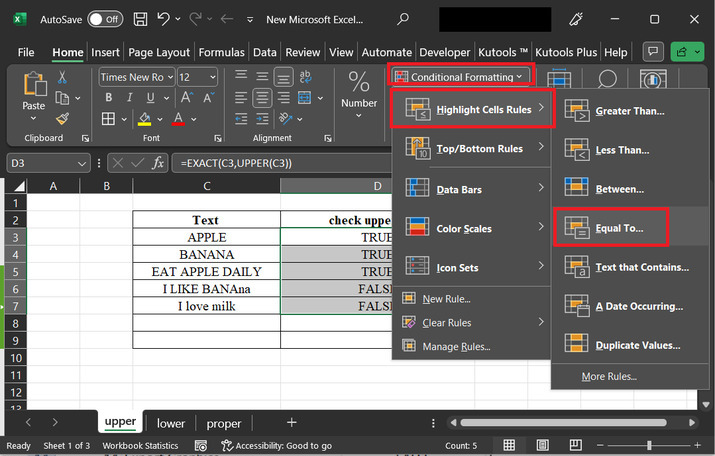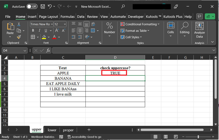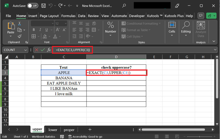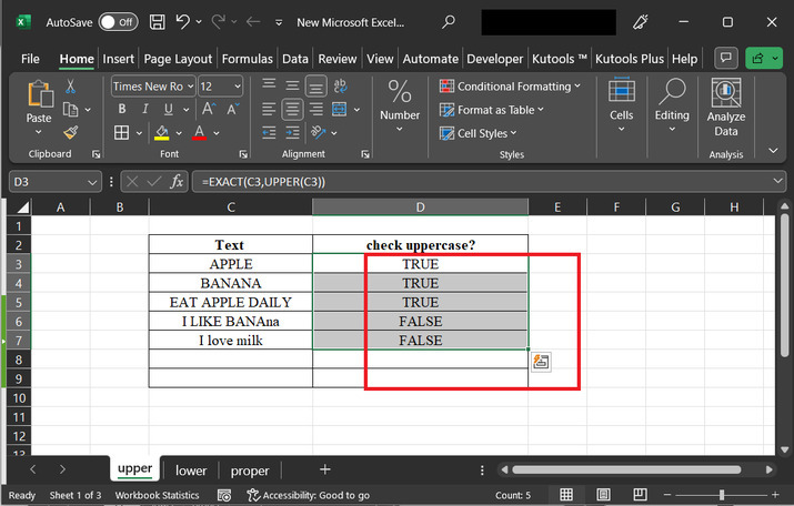 然後轉到D3單元格,輸入“=EXACT(C3,UPPER(C3))”。下面提供參考快照