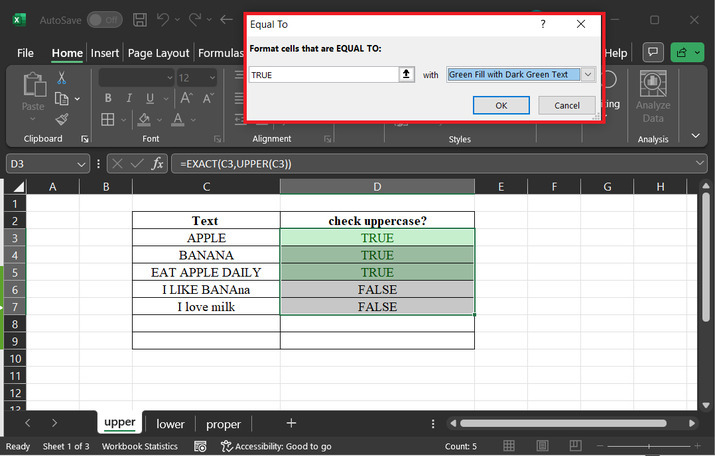 上述步驟將顯示“等於”對話方塊。在第一個輸入標籤中,輸入“True”,在第二個下拉選單中選擇使用者想要應用於true值的顏色,這裡將選擇“綠色填充,深綠色文字”選項,然後單擊“確定”按鈕。下面顯示參考快照