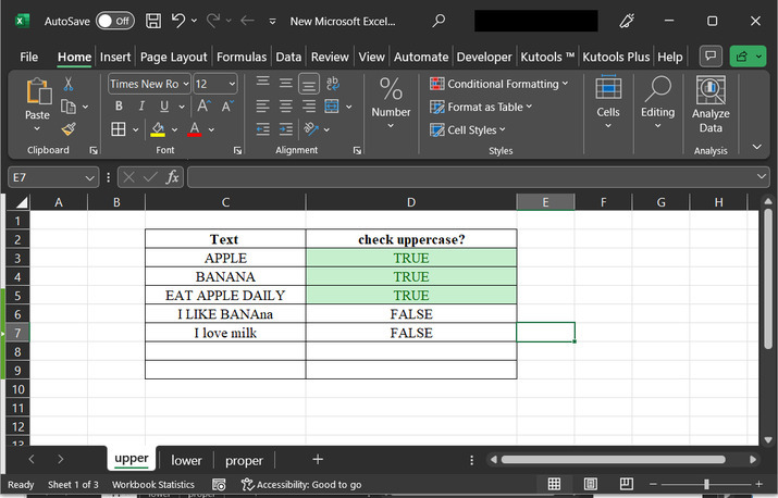 示例1:使用Excel公式識別Excel單元格中寫入的大寫句子或文字。