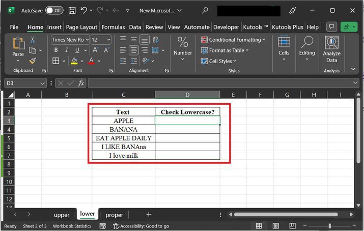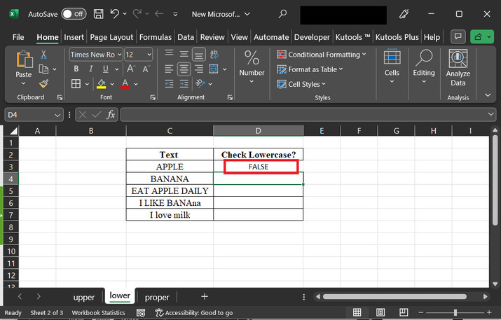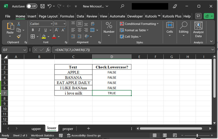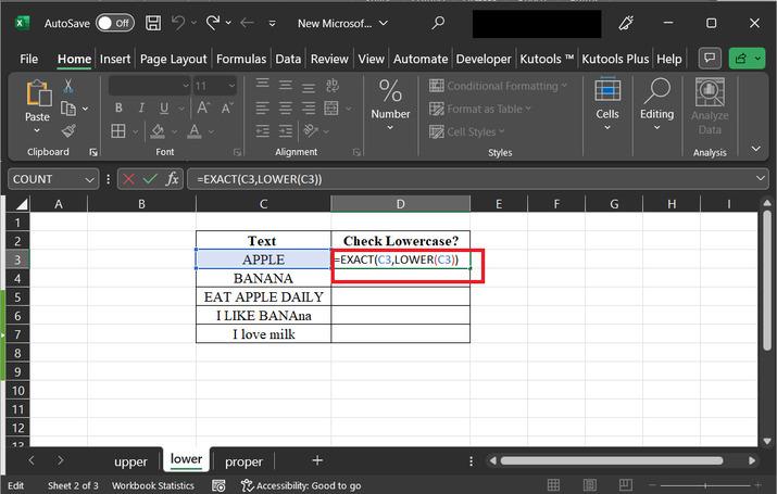 然後轉到D3單元格並輸入公式“=EXACT(C3,LOWER(C3))”。此公式將檢查C3單元格的值是否為小寫。