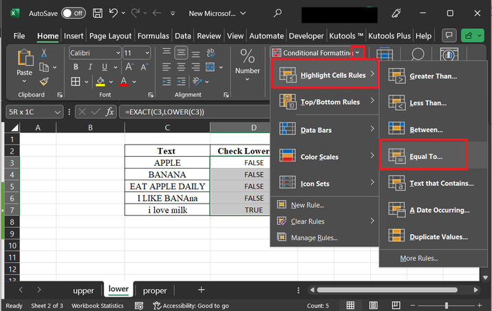然後轉到“開始”選項卡,單擊“條件格式”標籤,然後選擇“突出顯示單元格規則”選項。然後選擇“等於”選項。下面提供參考快照