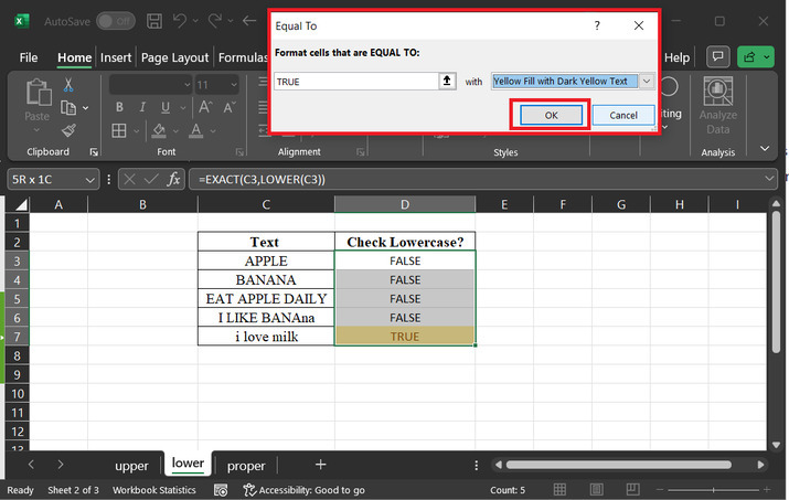上述步驟將顯示“等於”對話方塊。在第一個輸入標籤中,輸入“true”,在第二個下拉選單中選擇使用者想要應用於true值的顏色,這裡將選擇“黃色填充,深黃色文字”選項,然後單擊“確定”按鈕。下面顯示參考快照