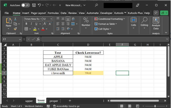 示例2:使用Excel公式識別Excel單元格中寫入的小寫句子或文字。
