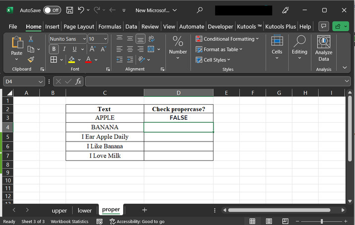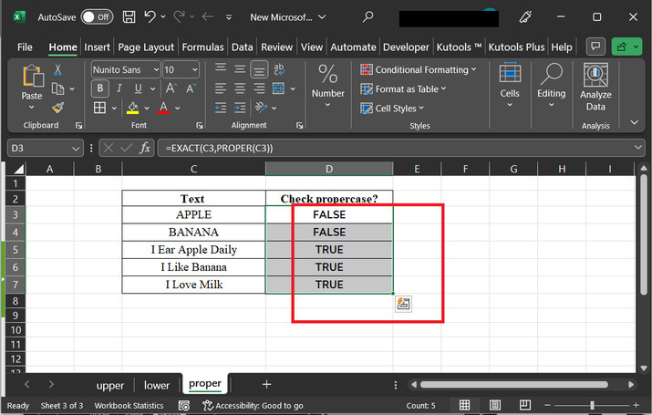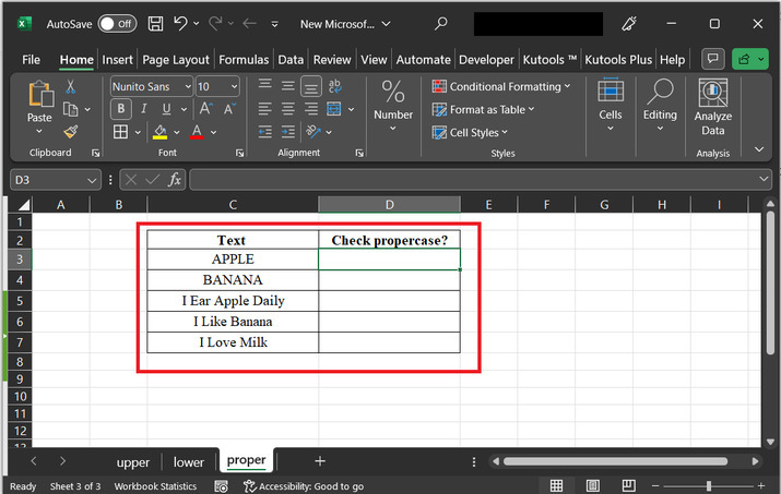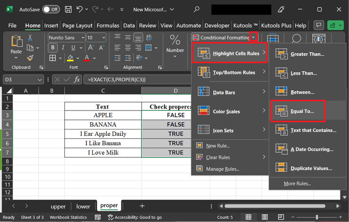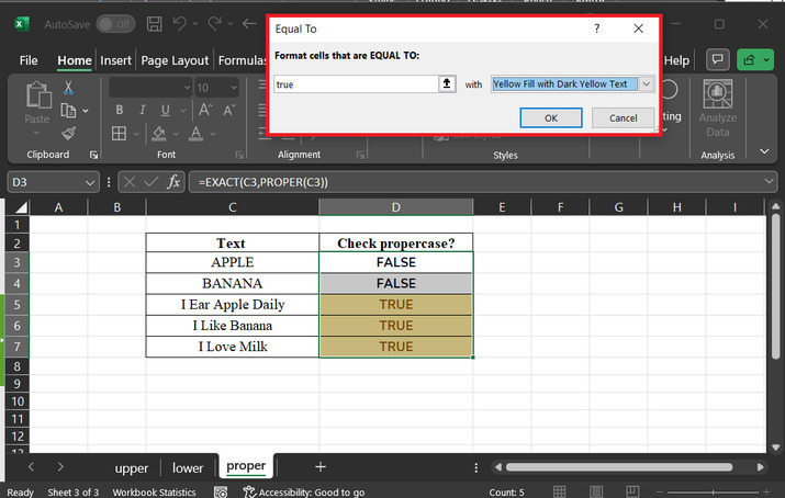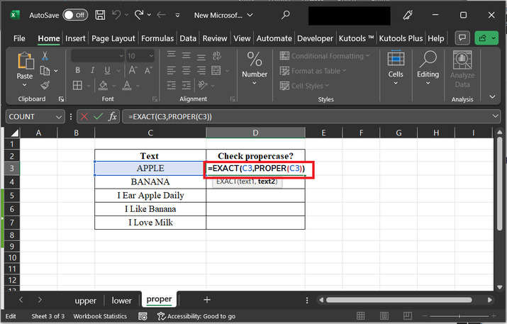 然後轉到D3單元格,輸入“=EXACT(C3,PROPER(C3))”。下面提供相同的快照