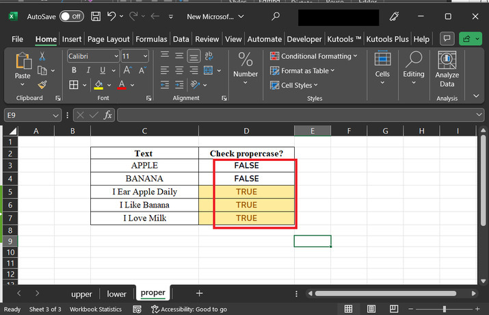 示例3:使用Excel公式識別Excel單元格中寫入的首字母大寫句子或文字。