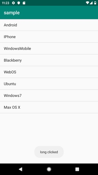 package app.com.sample; import android.os.Bundle; import android.view.View; import android.widget.AdapterView; import android.widget.ArrayAdapter; import android.widget.ListView; import android.widget.Toast; import androidx.appcompat.app.AppCompatActivity; public class MainActivity extends AppCompatActivity { String[] mobileArray = {"Android", "IPhone", "WindowsMobile", "Blackberry", "WebOS", "Ubuntu", "Windows7", "Max OS X"}; @Override protected void onCreate(Bundle savedInstanceState) { super.onCreate(savedInstanceState); setContentView(R.layout.activity_main); ListView listView = findViewById(R.id.listView); ArrayAdapter adapter = new ArrayAdapter<>(this, android.R.layout.simple_list_item_1, mobileArray); listView.setAdapter(adapter); listView.setOnItemLongClickListener(new AdapterView.OnItemLongClickListener() { @Override public boolean onItemLongClick(AdapterView<?> arg0, View arg1, int pos, long id) { Toast.makeText(getApplicationContext(), "long clicked", Toast.LENGTH_SHORT).show(); return true; } }); } }