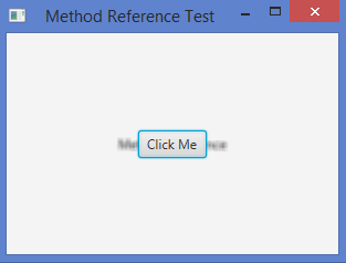 import javafx.application.*; import javafx.beans.property.*; import javafx.event.*; import javafx.scene.*; import javafx.scene.control.*; import javafx.scene.layout.*; import javafx.stage.*; import javafx.scene.effect.*; public class MethodReferenceJavaFXTest extends Application { private Label label; public static void main(String[] args) { launch(args); } @Override public void start(Stage primaryStage) { Pane root = new StackPane(); label = new Label("Method Reference"); Button clickMe = new Button("Click Me"); clickMe.setOnAction(this::handleClickMe); // method reference root.getChildren().addAll(label, clickMe); primaryStage.setTitle("Method Reference Test"); primaryStage.setScene(new Scene(root, 300, 200)); primaryStage.show(); } private void handleClickMe(ActionEvent event) { if(label.getEffect() == null) { label.setEffect(new BoxBlur()); } else { label.setEffect(null); } } }