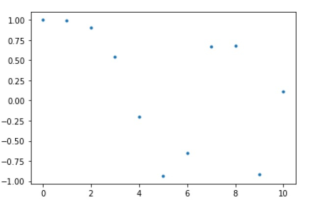 [ 0. 1. 2. 3. 4. 5. 6. 7. 8. 9. 10.] [ 1. 0.99383351 0.90284967 0.54030231 -0.20550672 -0.93454613 -0.65364362 0.6683999 0.67640492 -0.91113026 0.11527995]