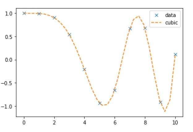 function_interpolate = interp1d(A, B, kind = 'cubic') #providing ‘cubic’ in the parameter ‘kind’.