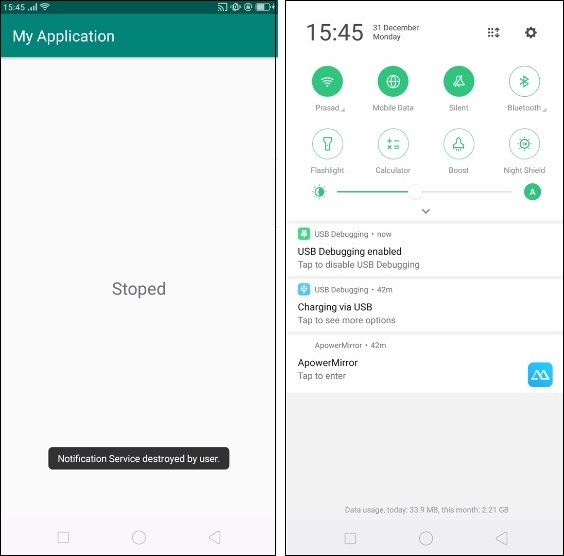 在上面的結果中,服務已啟動,現在點選 TextView,它將停止通知服務,如下所示 -