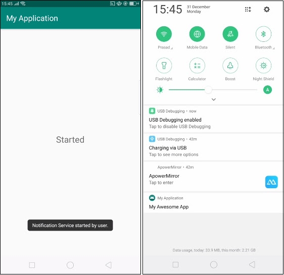 startForeground(1337, notification);要啟動和停止前臺服務,請使用以下程式碼 -