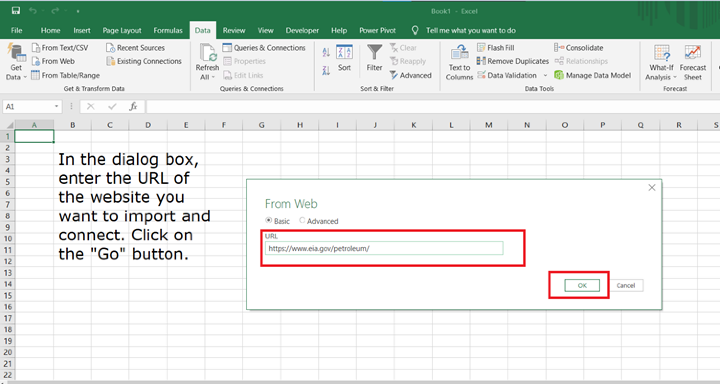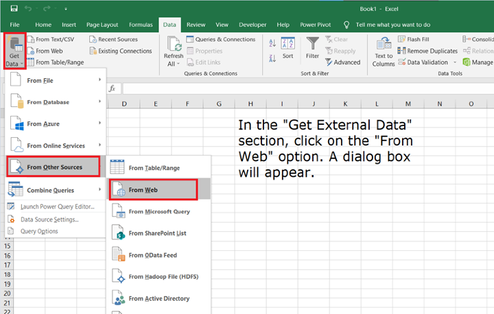 步驟 3 - 如果您希望獲取外部資料。請轉到“獲取外部資料”部分並選擇“從 Web”選項。之後將立即出現一個對話方塊。
