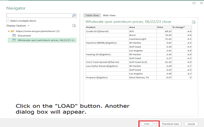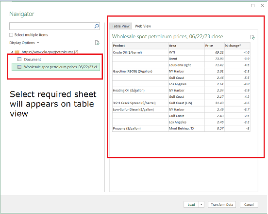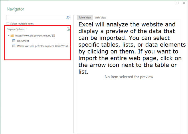 步驟 6 - 要從網站訪問必要的資訊,請先導航到 Excel。到達那裡後,選擇評估網站的選項,並在 Excel 仔細檢查它時稍等片刻。在完成對網站材料的分析後,將顯示一個預覽,其中詳細說明了可立即匯入的資料。如果您認為有必要和/或更願意匯入您選擇的特定表格、列表或資料元素;只需相應地點選這些區域,而如果整個網頁的各個方面都具有重要意義並且需要整體匯入 - 則將滑鼠懸停在其表格/列表上,同時按下位於該表格/列表旁邊的箭頭符號。