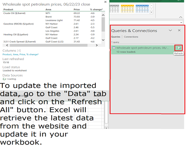 步驟 10 - 要維護準確的匯入資料,請轉到“資料”選項卡並選擇“重新整理全部”。此選項提示 Excel 從網站獲取最新資訊並根據需要將其合併到您的工作簿中。