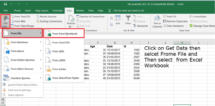 步驟3 - 選擇“獲取資料”,然後轉到“來自檔案”,然後從列表中選擇“來自Excel工作簿”選項。