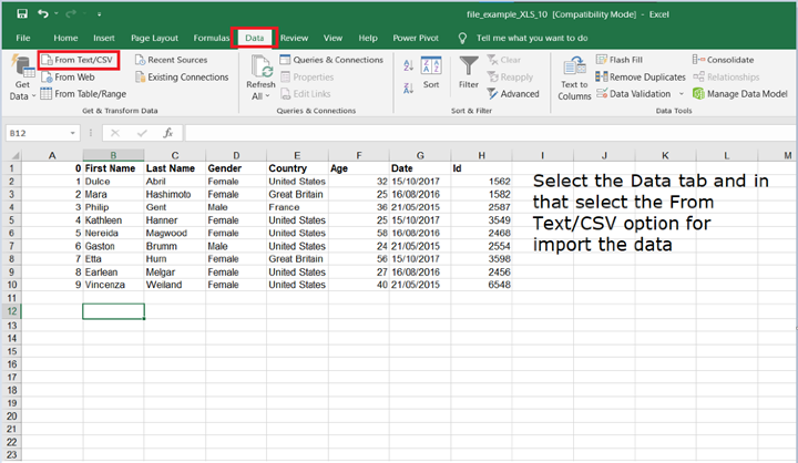 步驟1 - 選擇“資料”選項卡,然後選擇“來自文字/CSV”選項。