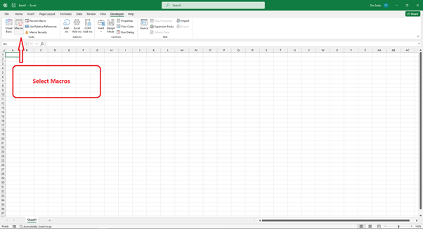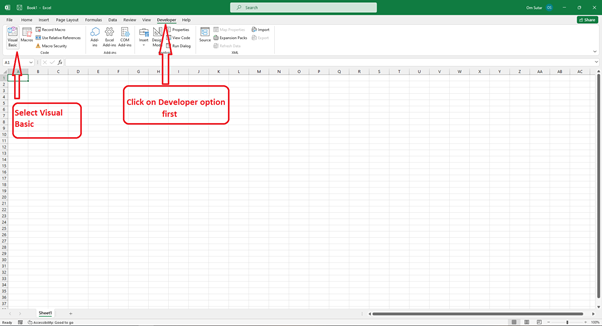 步驟 1 - 要在 Excel 中開啟 Visual Basic 編輯器,只需按鍵盤上的“Alt+F11”。或者,您也可以導航到功能區中的“開發工具”選項卡,然後選擇“Visual Basic”選項。