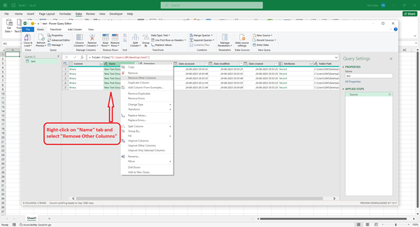 步驟 6 - 在 Power Query 編輯器中,右鍵單擊“名稱”列標題,然後選擇刪除其他列選項。