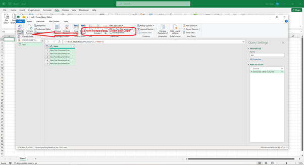 步驟 7 - 透過單擊“關閉並載入”或“關閉並載入到”將檔名匯入 Excel 單元格來關閉 Power Query 編輯器。