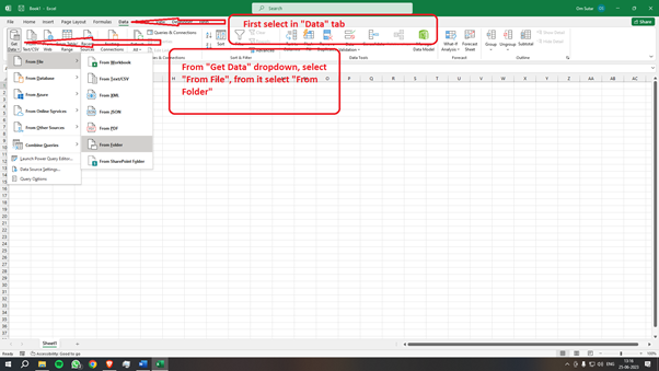 步驟 2 - 要訪問所需資料。請導航到“資料”選項卡。接下來。選擇“獲取資料”選項,然後選擇“來自檔案”。最後。選擇“來自資料夾”選項。