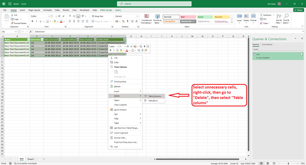 步驟 6 - 現在您將獲得有關檔案或任何資料夾的所有資訊。選擇不需要的單元格,右鍵單擊,轉到“刪除”,然後選擇“表列”。