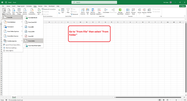 要訪問所需的功能,請導航到“獲取資料”選單。在那裡,請在其中選擇“來自檔案”選項。然後從輔助下拉選單中選擇“來自資料夾”選項。這樣做,將提示出現一個專門用於檔案選擇的資源管理器視窗。