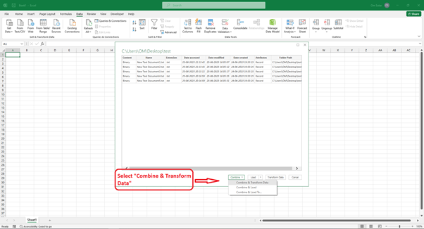選擇資料夾後,將出現“合併檔案”視窗。在這裡,您可以配置各種匯入設定,以自定義 Excel 如何匯入文字檔案。選擇“合併和轉換”。