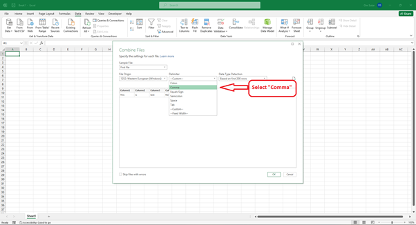 在“合併檔案”視窗中,您可以預覽並選擇要匯入的特定文字檔案。在分隔符下拉列表中,選擇“逗號”。