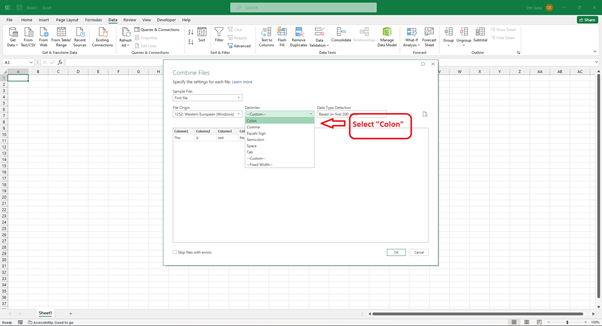 在“合併檔案”視窗中,您可以預覽並選擇要匯入的特定文字檔案。在分隔符下拉列表中,選擇“冒號”。