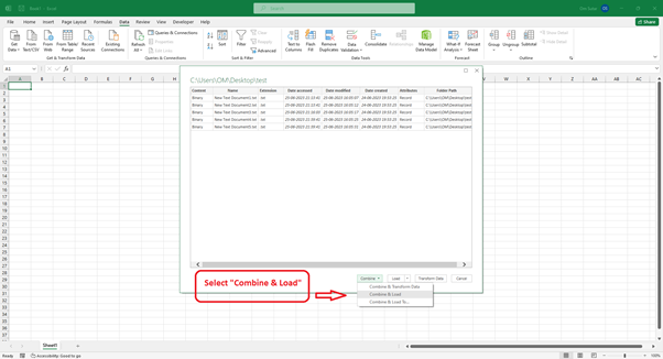 選擇資料夾後,將出現“合併檔案”視窗。在這裡,您可以配置各種匯入設定,以自定義 Excel 如何匯入文字檔案。選擇“合併和載入”。