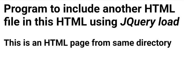 <html> <head> <script src="https://code.jquery.com/jquery-1.11.3.min.js"></script> <script> $(function() { $("#includeHtml").load("result.html"); }); </script> </head> <body> <h2>Program to include another HTML file in this HTML using <i>JQuery load</i></h2> <div id="includeHtml"></div> </body> </html>