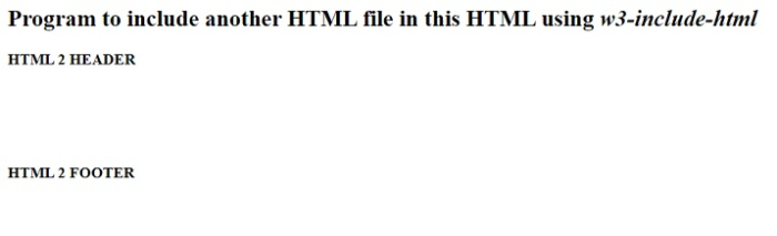 <html> <body> <h2>Program to include another HTML file in this HTML using <i>w3-include-html</i></h2> <div w3-include-html="result.html"></div> <script> function addHTML() { var el, i, domEl, fileName, xmlHttp; /*Iterate all DOM*/ el = document.getElementsByTagName("*"); for (i = 0; i < el.length; i++) { domEl = el[i]; /*find the element having w3-include-html attribute*/ fileName = domEl.getAttribute("w3-include-html"); if (fileName) { /*http request with attribute value as file name*/ xmlHttp = new XMLHttpRequest(); xmlHttp.onreadystatechange = function() { if (this.readyState == 4) { if (this.status == 200) { domEl.innerHTML = this.responseText; } if (this.status == 404) { domEl.innerHTML = "Page not found."; } /* Remove the attribute and invoke the function again*/ domEl.removeAttribute("w3-include-html"); addHTML(); } } xmlHttp.open("GET", fileName, true); xmlHttp.send(); /*function ends*/ return; } } } addHTML(); </script> </body> </html>