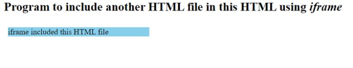 <html> <head> <h2>Program to include another HTML file in this HTML using <i>iframe</i></h2> <style> iframe[iframetag] { border: none; } </style> </head> <body> <div id="iframeDiv"> <iframe src="result.html" iframetag></iframe> </div> </body> </html>