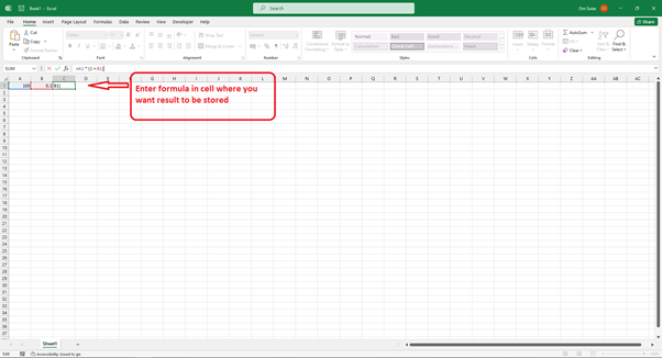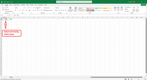 步驟 2 − 在單元格中輸入初始值,例如單元格 A1,需要根據電子表格中的百分比進行更改或調整(這裡我們取 100)。