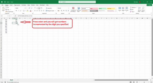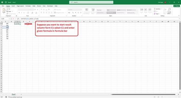 步驟 2 − 選擇一個空白單元格用於儲存初始結果,然後在公式欄中鍵入以下公式:=OFFSET($X$X,(ROW()-1)*X,0),其中 $X$X 是起始引用單元格。如果我們想將單元格引用增加 3,則公式將如下所示:“=OFFSET($A$3,(ROW()-1)*3,0)。” 最後,按 Enter 鍵。