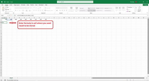 步驟 2 − 第二步是選擇一個空白單元格作為第一個結果,然後在公式欄中輸入公式 =OFFSET($X$X,0,(COLUMN()-1)*3),其中 $X$X 是起始引用單元格。如果我們想將單元格引用增加 2,則公式將顯示為“=OFFSET($B$1,0,(COLUMN()-1)*2)”,然後我們將按 Enter 鍵完成該過程。