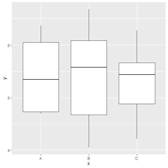 ggplot(df,aes(x,y))+geom_boxplot(fatten=3)s