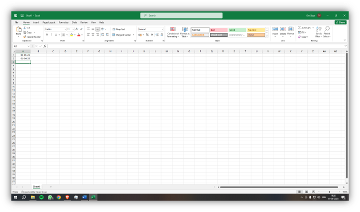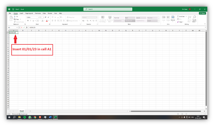 步驟 1 − 從選擇一個特定單元格開始,以容納您的初始日期,並以您首選的格式正確輸入它(例如,在 A1 中輸入“01/01/2023”)。