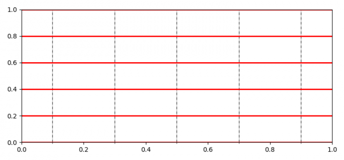import matplotlib.pyplot as plt from matplotlib.ticker import MultipleLocator plt.rcParams["figure.figsize"] = [7.50, 3.50] plt.rcParams["figure.autolayout"] = True fig, ax = plt.subplots() ax.yaxis.grid(which="major", color='r', linestyle='-', linewidth=2) ml = MultipleLocator(0.10) ax.xaxis.set_minor_locator(ml) ax.xaxis.grid(which="minor", color='k', linestyle='-.', linewidth=0.7) plt.show()