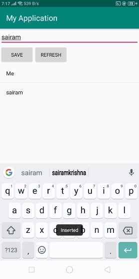 <?xml version = "1.0" encoding = "utf-8"?> <LinearLayoutxmlns:android = "http://schemas.android.com/apk/res/android" xmlns:tools = "http://schemas.android.com/tools" android:layout_width = "match_parent" android:layout_height = "match_parent" tools:context = ".MainActivity" android:orientation = "vertical"> <EditText android:id = "@+id/name" android:layout_width = "match_parent" android:hint = "Enter Name" android:layout_height = "wrap_content" /> <LinearLayout android:layout_width = "wrap_content" android:layout_height = "wrap_content"> <Button android:id = "@+id/save" android:text = "Save" android:layout_width = "wrap_content" android:layout_height = "wrap_content" /> <Button android:id = "@+id/refresh" android:text = "Refresh" android:layout_width = "wrap_content" android:layout_height = "wrap_content" /> </LinearLayout> <ListView android:id = "@+id/listView" android:layout_width = "match_parent" android:layout_height = "wrap_content"> </ListView> </LinearLayout>