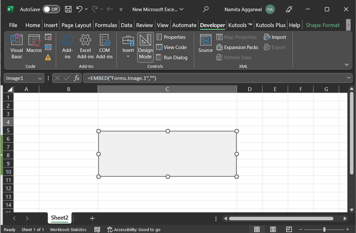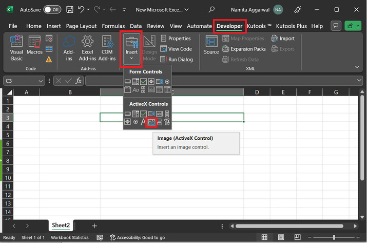 要在Excel中插入圖片控制元件功能,請考慮一個空Excel工作表。在空Excel工作表中,點選“開發者”選項卡,然後選擇“插入”選項。然後轉到“ActiveX控制元件”,並點選Excel工作表中最後一個第三個按鈕中的圖片選項。為了便於參考,請考慮以下提供的Excel工作表