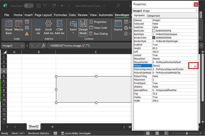示例1:使用“開發者”選項卡中提供的ActiveX控制元件在Excel中插入圖片控制元件。