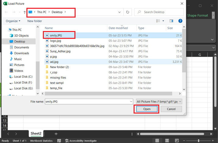 上述步驟將開啟一個“載入圖片”對話方塊。在“載入圖片”對話方塊中,瀏覽使用者想要插入到Excel工作表中的jpg檔案。這裡,所用圖片的名稱為“smily.jpg”,它位於桌面位置。最後,點選“確定”按鈕。